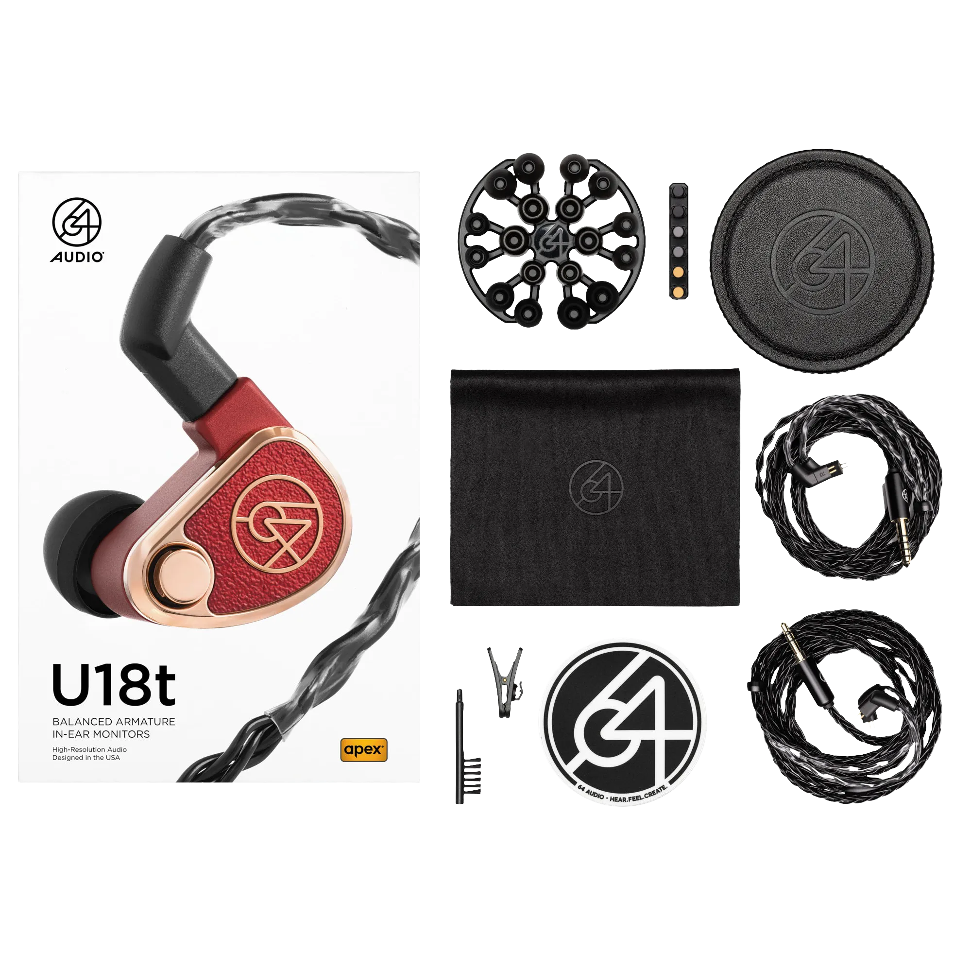 Equipped with 64 Audio’s Air Pressure Exchange (Apex) technology, the U18t features a patented venting system that reduces listener fatigue while maintaining high isolation. This allows for a more immersive soundstage and comfortable long-term listening. Four Apex module options (mX, m12, m15, and an exclusive PVD-coated stainless steel m20) let users tailor isolation levels and airflow to their preferences.